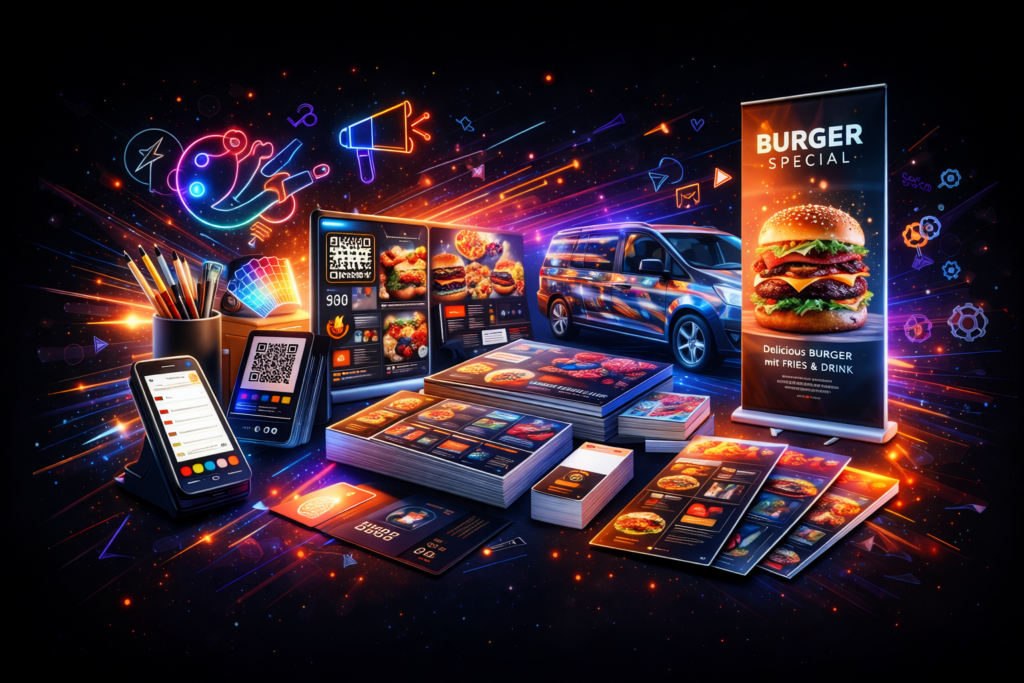 Wir gestalten professionelle Flyer, Poster, Speisekarten, Banner und Werbematerialien – inklusive hochwertigem Druck.