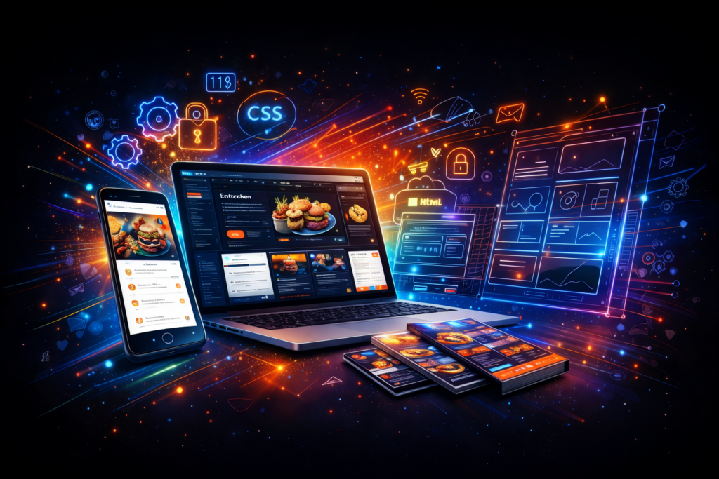 Moderne Website, Social Media Setup, hochwertiges Menüdesign, Flyer & Werbematerial sowie Kassensystem-Integration.